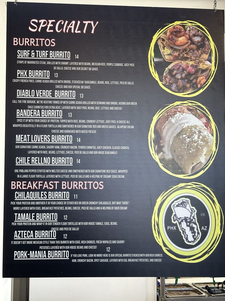 - PHX Burrito: A hearty stack of crispy french fries, carne asada, and guacamole, all wrapped up for $14.00.